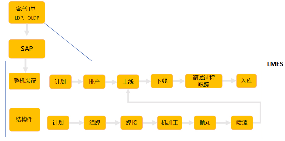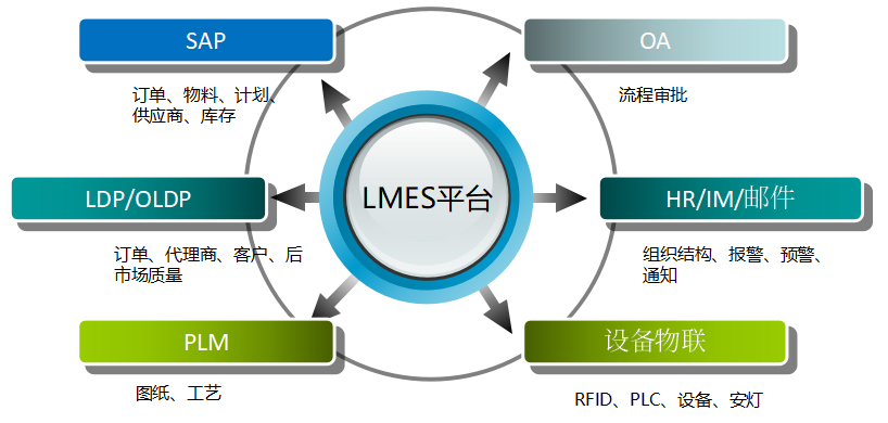 串聯整個生產過程,操作平臺統一、數據存儲統一,為后續進行數據分析等管理工作打好基礎;與LDP、OLDP交互,實現客戶訂單過程可視化